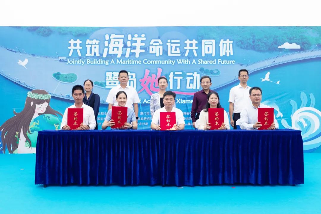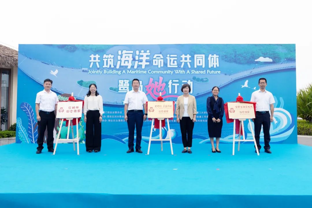 活动现场,翔安区妇联、厦门市海洋与渔业研究所、翔安区人民检察院、中共翔安区民安街道工作委员会、厦门国贸锄山旅游投资有限公司五方代表共同签订了“共建海洋命运共同体 鹭岛她行动”项目共建协议书,厦门市妇联党组书记、主席庄海英与陈小芬等见证了协议书的签署。“她韧性·卫蓝行动妇女微家”“红树林妇女微家”“保育生物多样性妇女微家”3个特色妇女微家成立,依托“微家”阵地,将全面开展红树林保育知识“五进”活动。陈小芬参与并为“保育生物多样性妇女微家”揭牌。