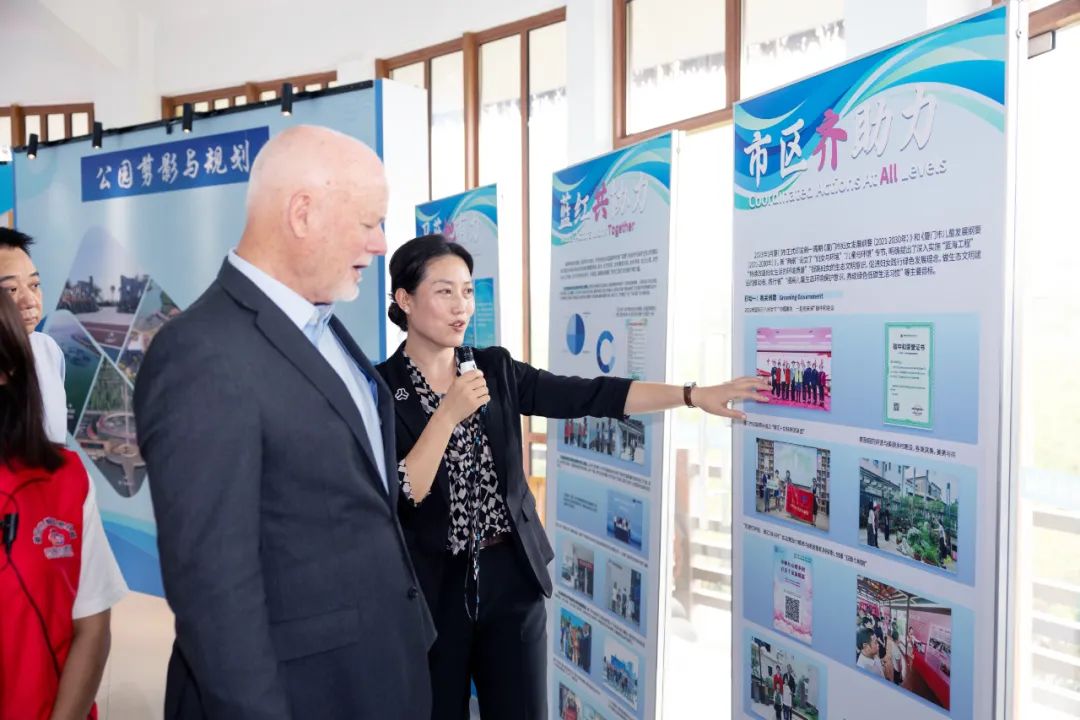 彼得·汤姆森(Peter Thomson)参观了海洋特色文化和环境保护展馆,周琛为其讲解了厦大助力厦门市妇女儿童参与海洋环境保护的实践和经验。