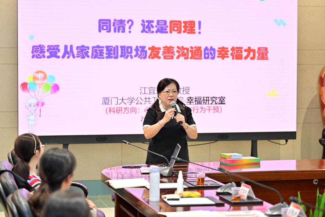学习班最后,公共卫生学院副教授江宜珍为大家带来以“同情?还是同理!感受从家庭到职场友善沟通的幸福力量”为题的家庭教育讲座,讲座知识性与趣味性并存,在轻松愉悦的气氛中妇女干部履职能力提升班落下帷幕。