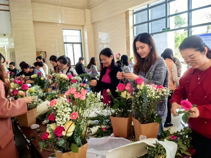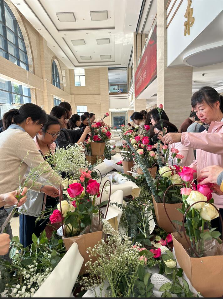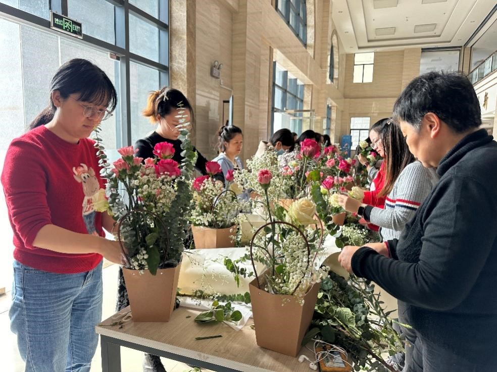 在学院领导和工会的关怀与大力支持下,妇委会精心策划了这场插花活动。女老师们纷纷发挥创意,修剪花材,将原本普通的花朵打造成一个个独具魅力的艺术品。她们在欢声笑语中相互交流心得,彼此分享插花技巧,共同享受这一场视觉与心灵的盛宴。
