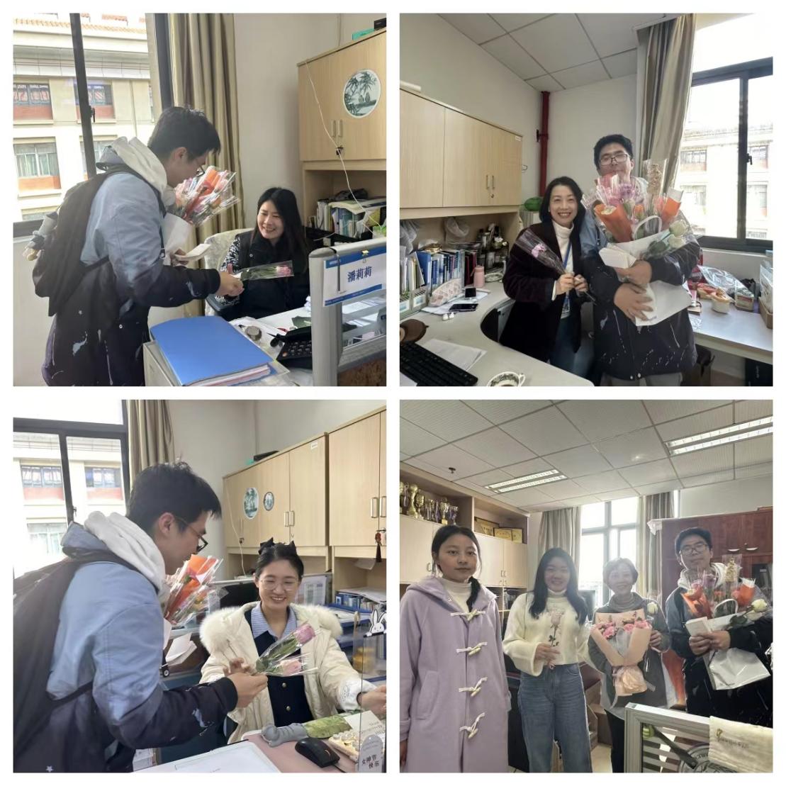 3月8日至3月15日期间,环境与生态学院举办了“甜蜜三月,共享芳华”主题系列活动。针对女教工,活动涵盖美食品鉴、创意插画、致敬美好的她三项活动,美食品鉴沙龙上,五彩缤纷的气球装饰灵动可爱,参与活动的老师们精心准备了各类蛋糕、半熟芝士、麻薯、饼干、蛋挞、漳州贡糖、柠檬无骨鸡爪等美食,令人食欲大开,大家仿佛置身一场快乐的园游会。创意插花活动,组织女老师们共赴一场花的约会,感受浓浓的节日氛围。环生院还为女教师和金泉楼女性物业工作人员分别送上玻璃花瓶、香囊或玫瑰花,向她们致以最诚挚的节日祝福。针对女学生,环生院团委举办了“自然 自由 自信 自是你”女神节系列活动。通过“风传花信,雨濯春尘”“春日迟迟,卉木萋萋”“春色如许,拈花拾趣”三个主题活动和“送你一朵限定鲜花”的彩蛋活动,让环生院的女生们尽情感受手工作品和艺术创作带来的身心愉悦,以及学院对大家真挚的祝福和情谊。