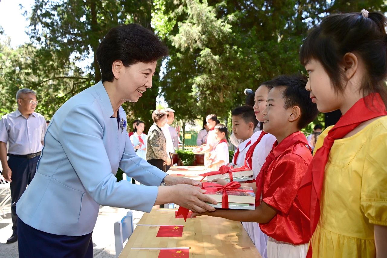 节日的中国儿童中心处处洋溢着欢声笑语,优美激昂的红色歌曲在园区内回荡,谌贻琴和孩子们亲切互动。在“我和祖国心贴心”活动区,与小朋友一道将祝福语贴到中国地图上,共同感恩党,祝福伟大祖国。在“科创未来”活动区,为孩子们在人工智能、大模型和机器人等方面的科创成果点赞,鼓励小朋友现在勇当小科学家,未来争当大科学家。在“强身健体”活动区,询问孩子们最喜爱的体育项目、训练的快乐和收获,叮嘱他们加强体育锻炼、培养团结合作精神。在“我与祖国共成长”活动区,给孩子们赠送书籍,共同唱响《我和我的祖国》。她勉励孩子们树立远大志向,热爱科学、勤奋学习,强健体魄、磨练意志,德智体美劳全面发展,努力成长为堪当强国建设、民族复兴大任的栋梁之材。她强调,各级政府和有关部门要坚持儿童优先发展,深入实施儿童发展纲要,用心用情关爱少年儿童,加强流动、留守儿童和困境儿童权益保障。广大儿童工作者要当好儿童成长的引路人、儿童权益的守护人、儿童未来的筑梦人,家长要重言传重身教,引导孩子从小养成好思想好品行好习惯,促进儿童健康成长、全面发展。
