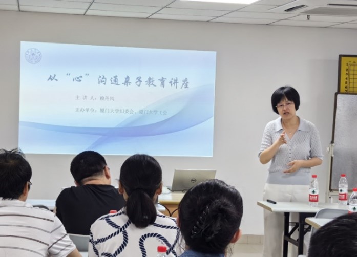 2024年6月12日晚,由厦门大学妇委会和厦门大学工会共同主办的从“心”沟通亲子教育讲座顺利开展,来自全校25个单位的30余名老师参与了此次活动,活动由厦门大学心理中心主任赖丹凤老师主讲,校妇委会主任、校工会副主席陈小芬老师主持。