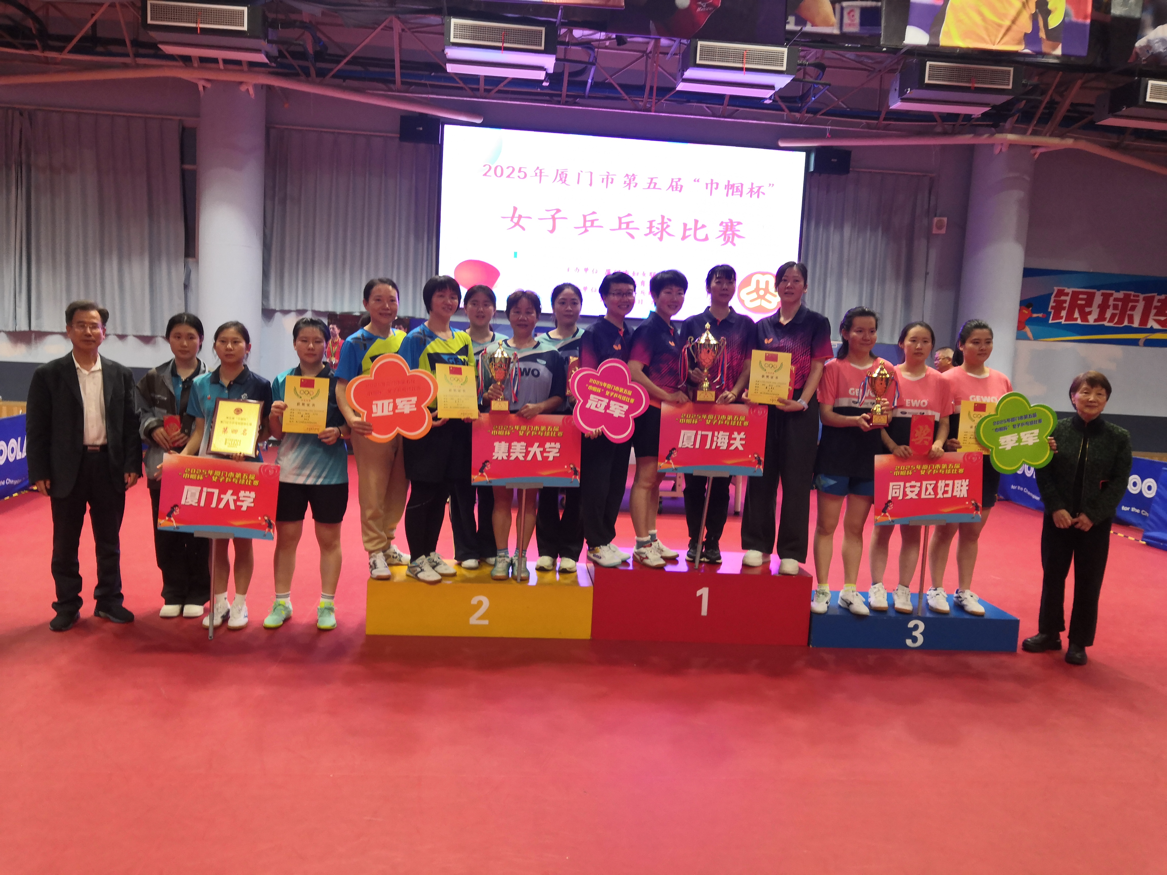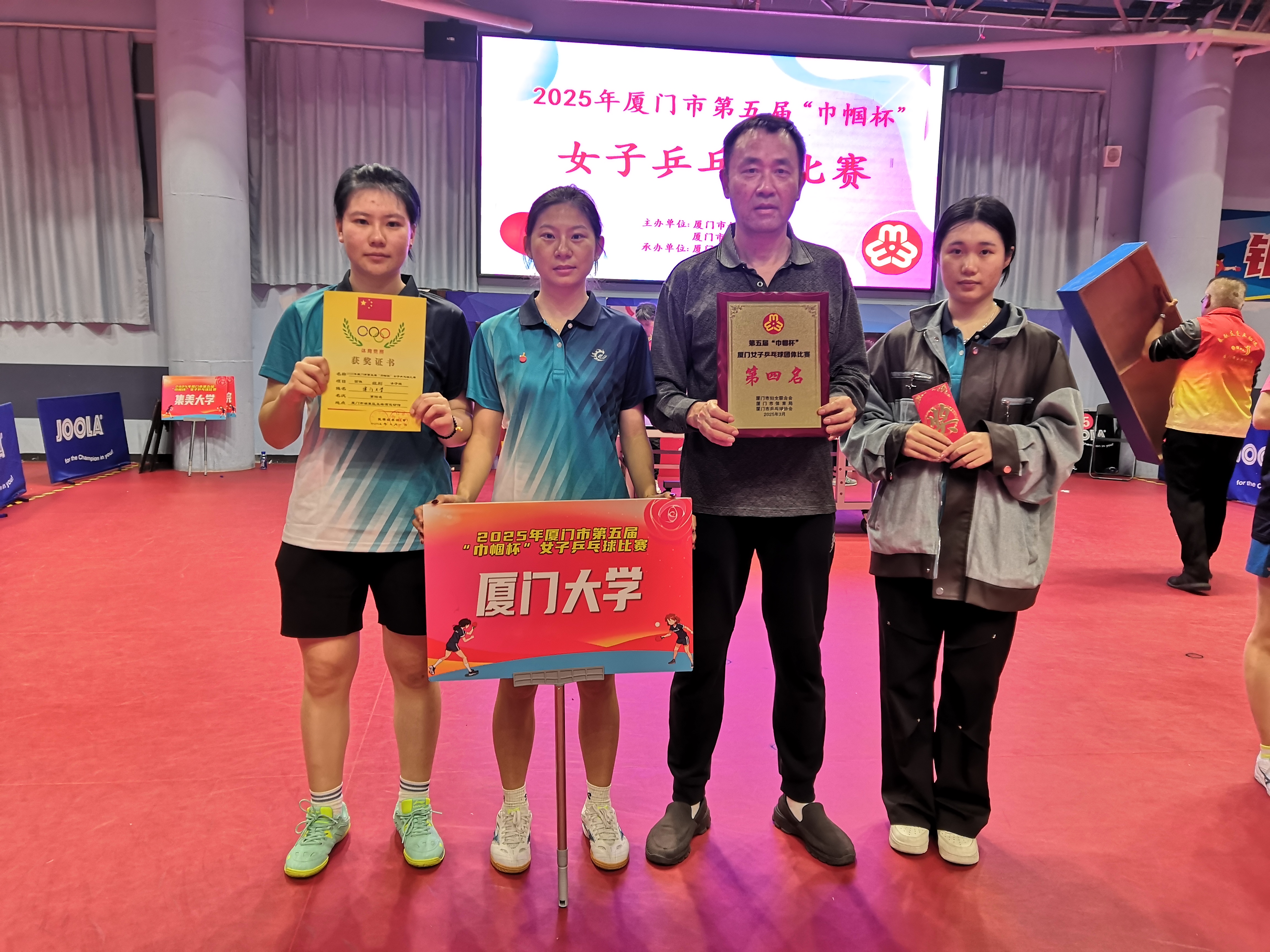 2025年3月1日至3月2日,厦门市第五届“巾帼杯”女子乒乓球比赛在五缘湾运动馆顺利举办。在厦门大学妇委会的精心组织下,厦门大学女子乒乓球队在领队柯志坚老师的带领下,经过两天的激烈角逐,最终荣获团体比赛第四名的佳绩,展现了厦大“巾帼”团结拼搏的精神风貌。