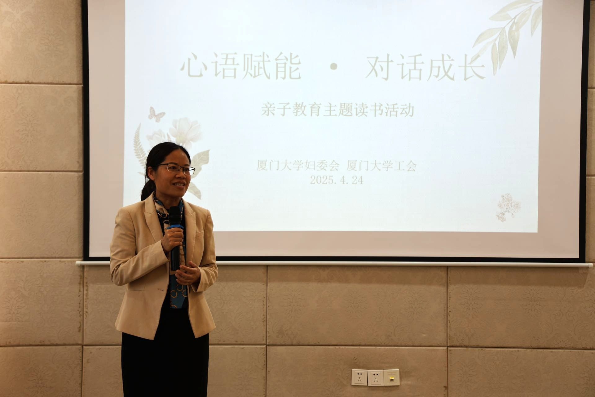 在第30个“世界读书日”到来之际,由厦门大学妇委会、校工会联合主办的“心语赋能·对话成长”主题读书活动,于2025年4月24日中午在翔安校区德旺图书馆顺利举办。此次活动聚焦家庭教育与心理成长,通过专题讲座、互动交流以及现场赠书等环节,为女教职工打造了一个温馨且实用的育儿交流平台。活动由校妇委会主任、工会副主席陈小芬主持。
