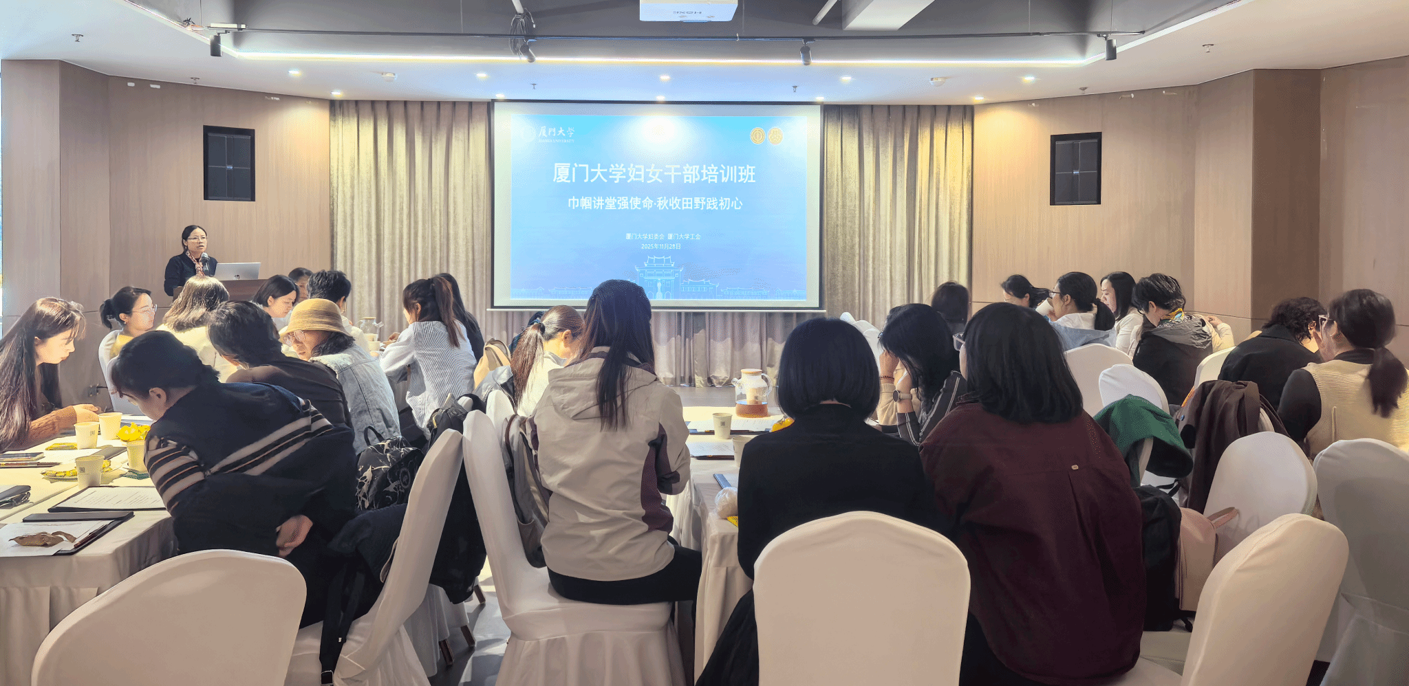 为深入学习贯彻习近平总书记在全球妇女峰会上的重要讲话精神,全面落实党的二十届四中全会部署要求,紧密围绕“十五五”规划中关于“坚持男女平等基本国策,保障妇女儿童合法权益”“加强家庭家教家风建设”等重点任务,2025年11月28日,厦门大学妇委会、厦门大学工会组织开展了以“巾帼讲堂强使命 秋收田野践初心”为主题的妇女干部培训暨劳动教育实践活动。活动由校妇委会主任、工会副主席陈小芬主持,工会副主席郭如梅及基层妇女干部代表参加了本次活动。