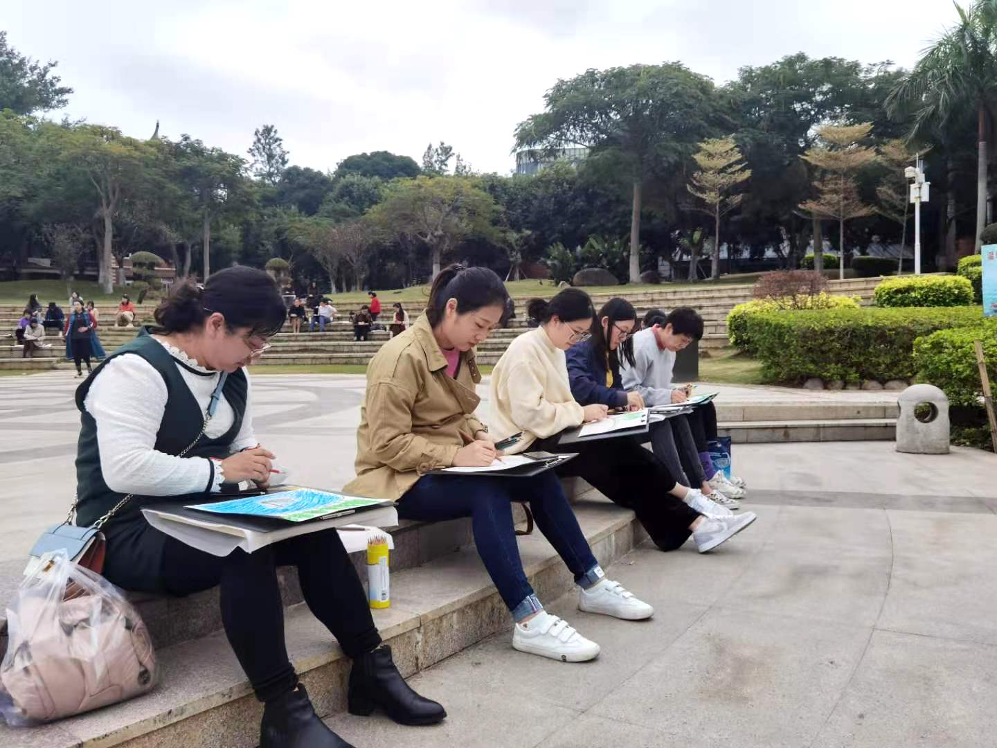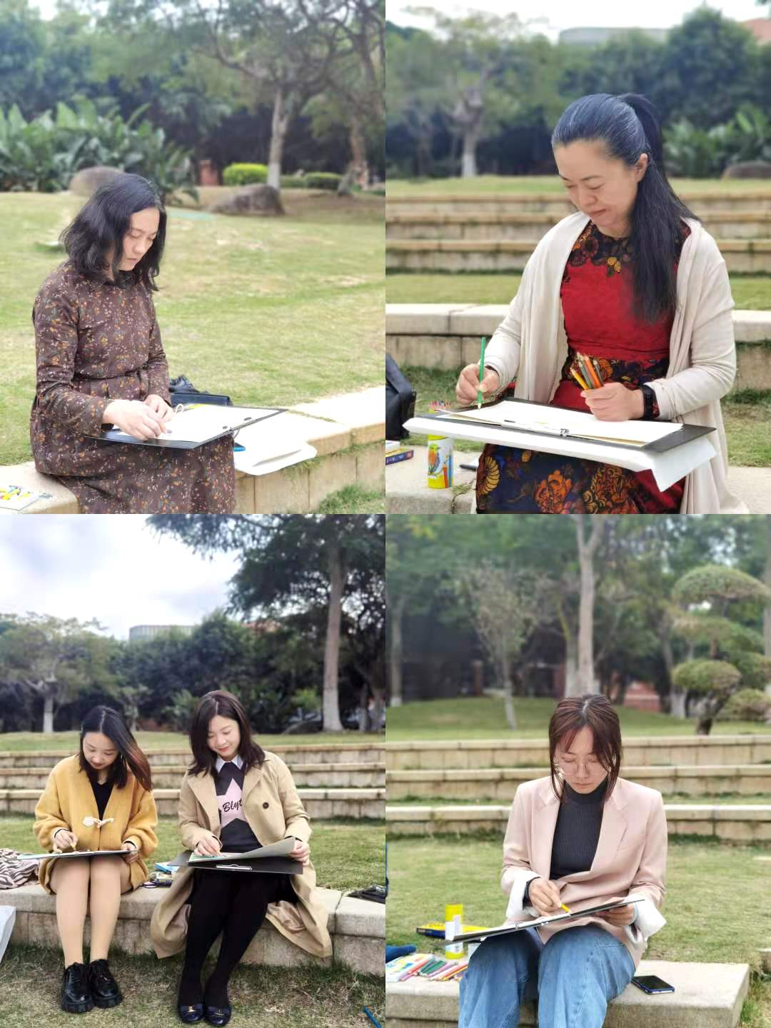 在了解了写生技法后,大家纷纷走出了教室,来到芙蓉湖畔用画笔勾勒多样的厦园风景。湖光山色、美景作陪,大家在舒适愉悦的氛围中挥洒创意、展现精彩。惬意戏水的黑天鹅、随风摇曳的凤凰木、庄严雄伟的颂恩楼……厦园风采跃然纸上。弹指一挥,老师们陆续完成了画作,在把作品装入画框的一刻,大家的欣喜自豪之感油然而生,纷纷拍照留念,定格难忘瞬间。