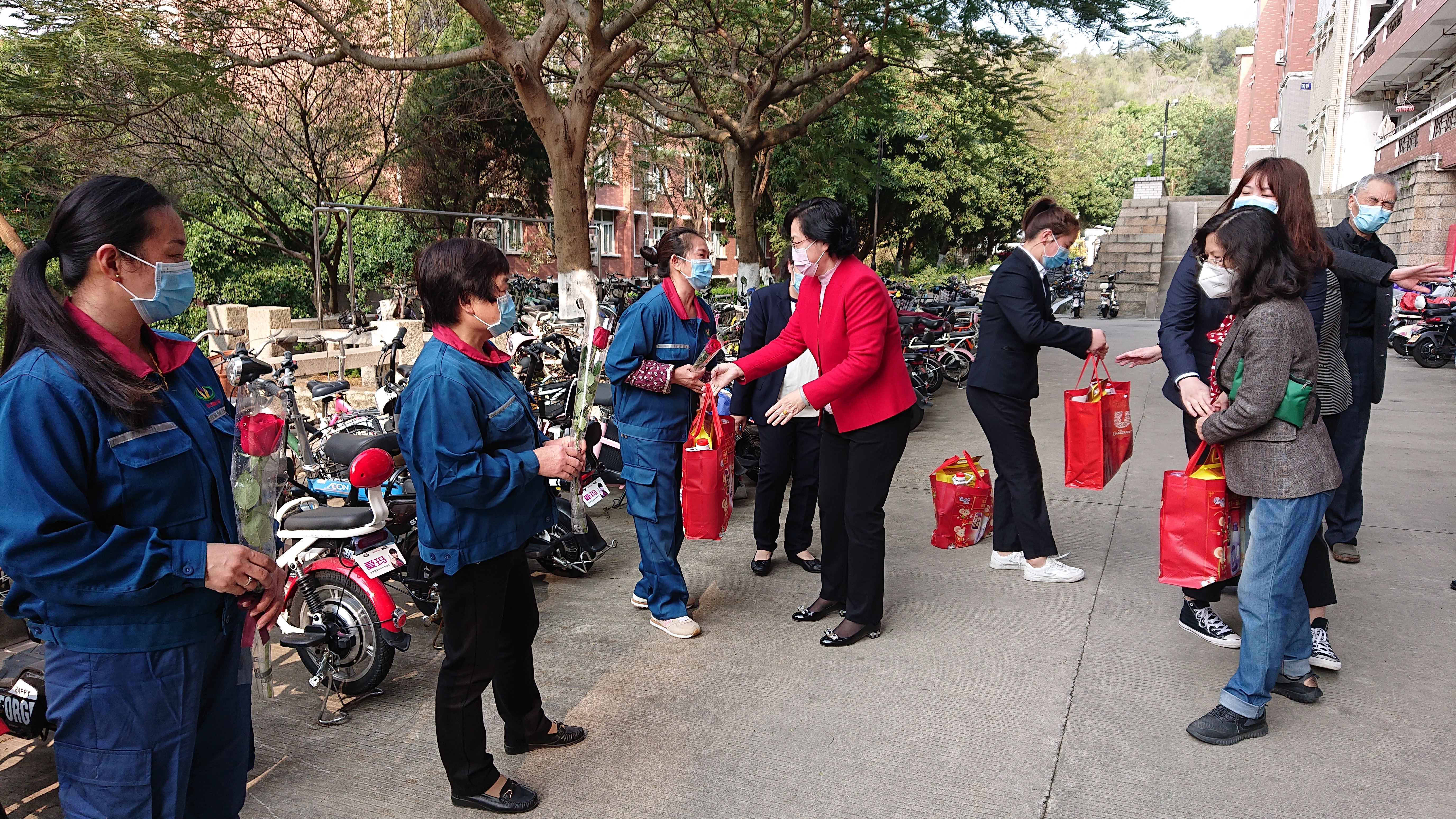 “三八”国际妇女节期间,校党委常委、副校长邓朝晖带队到后勤集团、厦大医院和附属翔安医院慰问奋战在防控一线的女职工,送去学校的关怀和节日的问候。校工会常务副主席叶鹏飞,校工会副主席、校妇委会主任蒋月,校医管办副主任史虞龙,校工会副主席、校妇委会副主任秦红梅,以及相关单位党政领导和一线女职工代表参加慰问活动。