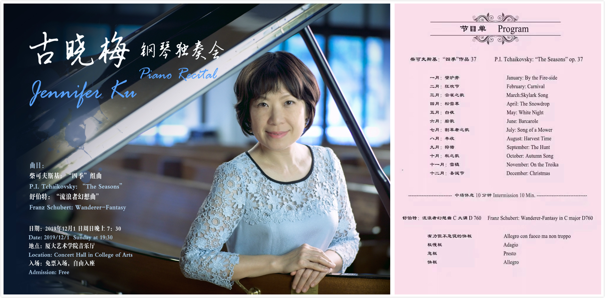 2019年12月1日晚7时半,厦门大学艺术学院音乐系古晓梅教授钢琴独奏会在该院的音乐厅举行。该场音乐会是免票入场,自由入席。整个音乐厅座无虚席,观众中有许多小朋友。