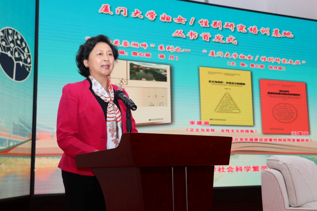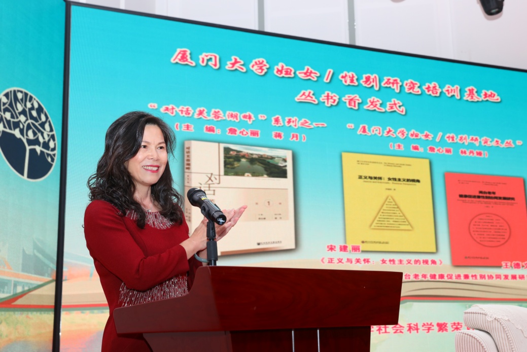 首发式由厦门大学妇女/性别研究基地副主任、校妇委会主任、校工会副主席、法学院教授蒋月主持。厦门大学原副校长、妇女/性别研究与培训基地主任、两套丛书主编詹心丽向来宾与师生们介绍了基地发展情况和丛书形成始由与背景。她说:厦大妇女研究基地自成立以来,在全国妇联、福建省和厦门市妇联领导的大力支持下,在厦门大学党委的领导下,在前基地主任陈力文的带领下,注重发挥厦门大学综合性大学优势和地缘优势,积极传播先进性别文化,荣获福建省“三八红旗集体”,“全国三八红旗集体”等光荣称号。近五年来,基地同仁们在原有的基础上不断努力,特别是借助“五缘”优势,在学校哲学繁荣计划项目经费的支持下,一是创办了《妇女/性别研究》学术刊物,二是开展相关科研项目促进学术成果,资助了16项课题,并和学生处联合开展“性别视角下的大学生全面发展”专项课题研究12项。在此基础上,我们编辑“妇女/性别研究文丛”,把各项课题的研究成果以专著形式出版。今天首发的便是我们首批资助课题中的两部,即厦门大学公共事务管理学院王德文教授的《闽台老年健康促进兼性别协同发展研究》,厦门大学马克思主义学院宋建丽教授的《正义与关怀:女性主义的视角》。三是为了推动不同学科之间交流分享,普及科学知识,传播先进性别文化,我们联合厦门大学翔安校区党工委、厦门大学社会科学研究处、厦门大学工会、厦门大学妇女委员会、厦门大学团委等单位在厦门大学校园举办跨学科活动“芙蓉湖畔对话”。“芙蓉湖畔对话”以性别为核心媒介,选取生命、科学、健康、教育、生态等主题,邀请不同专业背景的专家学者,以现场对话方式,通俗易懂又生动有趣地交流和分享对主题的理解和认识,传播哲学社会科学、自然科学、人文与艺术等领域的科学观念和知识,形式新颖,内涵丰厚,富有启迪,既吸引师生参与,又深受师生欢迎。今天首发《对话芙蓉湖畔》第1辑,就是根据前四期对话的现场录音而整理出来的文字稿,以达到更深广的传播效果。