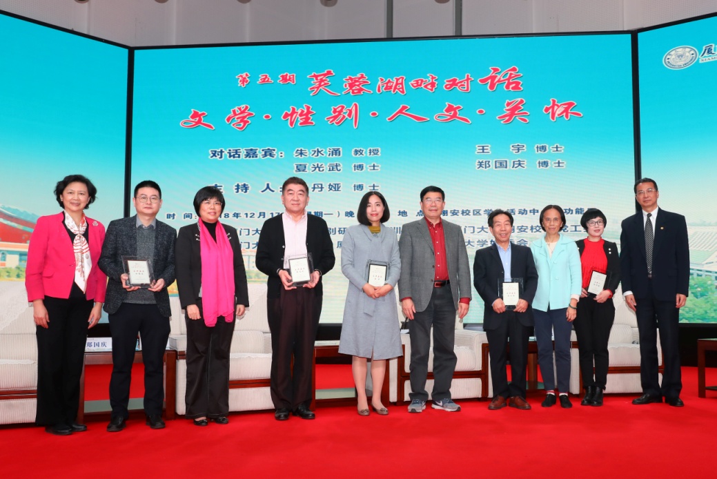 2018年12月17日晚,“第五期芙蓉湖畔对话——文学·性别·人文·关怀”暨《对话芙蓉湖畔》、《厦门大学妇女/性别研究文丛》系列丛书联合首发式在厦门大学翔安校区学生活动中心多功能厅隆重举行。出席本期对话活动与首发式的有厦门大学党委副书记、纪委书记、工会主席赖虹凯,厦门大学原党委副书记、关工委主任陈力文,厦门大学原副校长、妇女/性别研究与培训基地主任詹心丽,厦门大学翔安校区党工委副书记李峰,厦门大学工会常务副主席叶鹏飞,厦门大学出版社社长郑文礼,厦门大学团委主持工作副书记洪海松,厦门大学社科处副处长冯文晖,厦门大学图书馆副馆长、翔安校区图书分馆馆长戴鹭涛等学校有关领导和部门负责人,中国妇女研究会副会长叶文振、福建省妇女干部学校副校长顾志峰、厦门市妇联副主席朱秀敏、厦门市妇联组织联络部部长陈雯雅等,也分别代表相关组织机构到场祝贺。