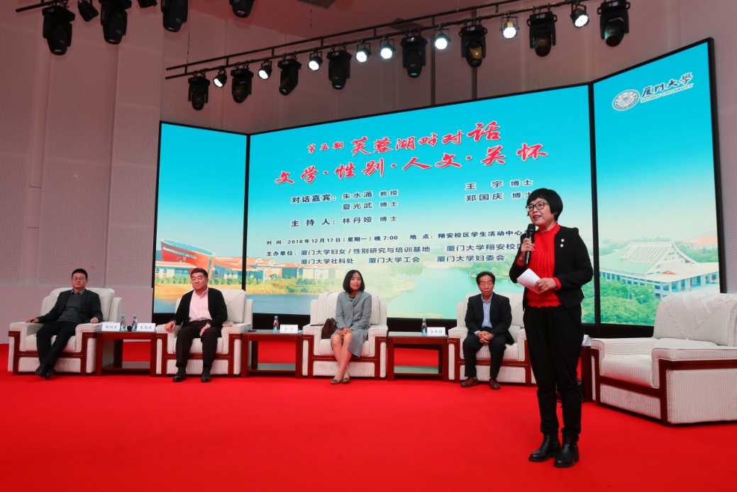 接着,“第五期芙蓉湖畔对话”开始。这期对话以“文学·性别·人文·关怀”为主题,厦门大学妇女/性别研究与培训基地常务副主任、人文学院林丹娅教授作为主持人,并特邀了文学史家、评论家朱水涌教授,现当代文学专家王宇教授,比较文学专家夏光武博士,文艺学专家郑国庆博士前来担任对话主嘉宾,校内外的三百多位嘉宾朋友与师生们闻风而来,共同参与了这场生动有趣且富有精神营养的对话活动。