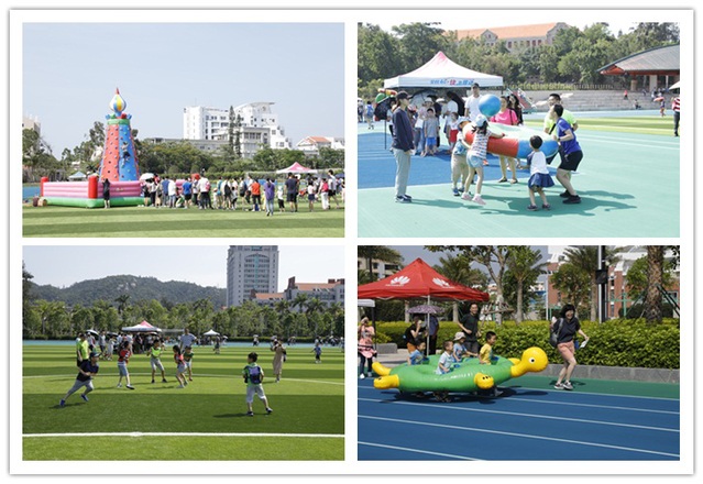 6月2日当天,粉色的攀岩塔、五彩的动感五环、龟兔赛跑、羊角球跳跳等12个项目在演武场一一亮相,气球小丑穿梭其中,给孩子们编出了气球魔法棒、小狗等玩具,平日体育竞技的演武场瞬间化作了欢乐的儿童嘉年华。每个到达现场的孩子都迫不及待地贴上胸贴,跃入场中,或找到伙伴三五成群地玩耍起来,或拉着爸爸妈妈的手奔向自己喜爱的项目。当天共有500多个家庭组参加到了活动中,每个项目都排着等待的队伍,但一点都不影响孩子们玩耍的兴致,许多教职员工也在排队时互相交流,都为学校举办的亲子运动会点赞!一位来自机关的教职工说:“孩子玩的很开心,这比放假在家看电视有意义多了,谢谢厦大让孩子有个欢乐的六一。”外文学院的老师则说:“平时忙于上课、科研,只有晚上和周末有空和孩子交流,谢谢学校为我们提供这么好的一个亲子互动的机会,感觉和孩子之间的感情加深了不少”;“厦大真棒!我们一定支持他在学校好好工作!”一位教职工家属激动地说道。