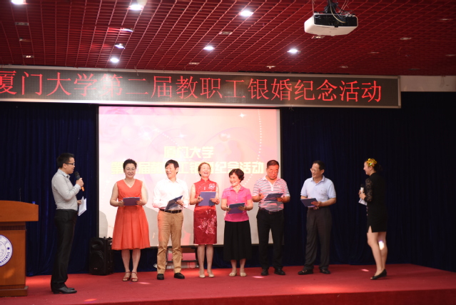 5月13日,厦门大学第二届教职工银婚纪念活动在自钦楼二楼多功能厅隆重举行。校党委副书记、纪委书记、校工会主席赖虹凯,校工会常务副主席宋毅、副主席李招淡、校工会副主席、妇委会副主任秦红梅,校宣传部副部长楼红英、校统战部副部长龙坚毅等领导应邀出席本次纪念活动。本次活动邀请到来自我校二十个单位的25对伉俪庆祝银婚。纪念活动由茹晓燕与熊剑龙共同主持。