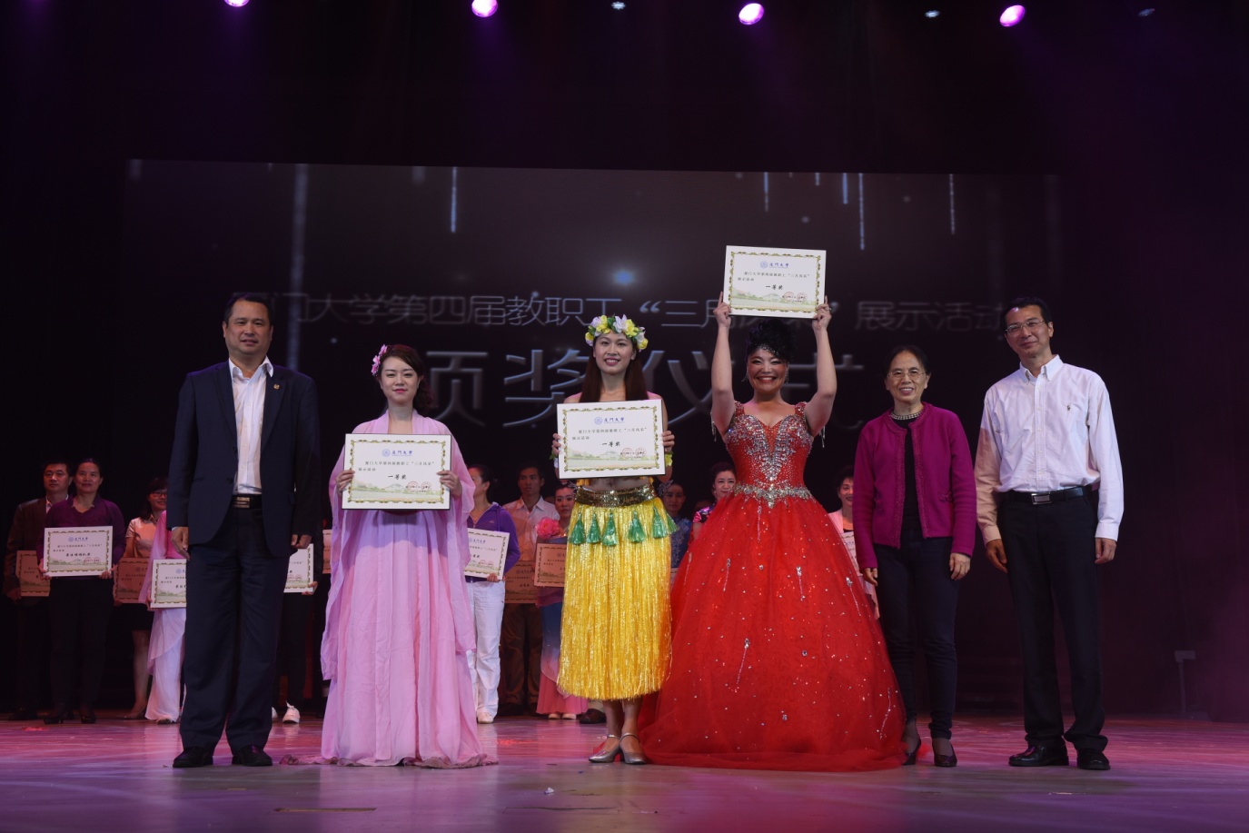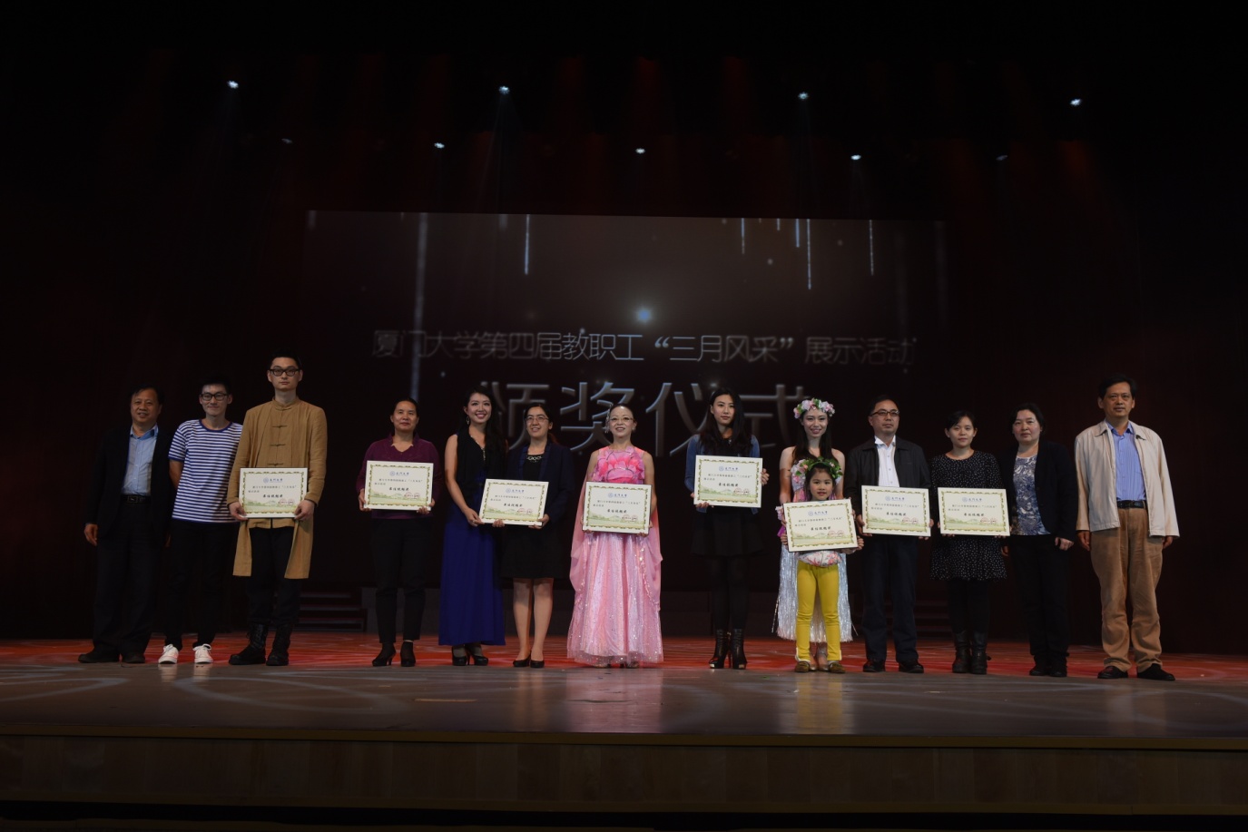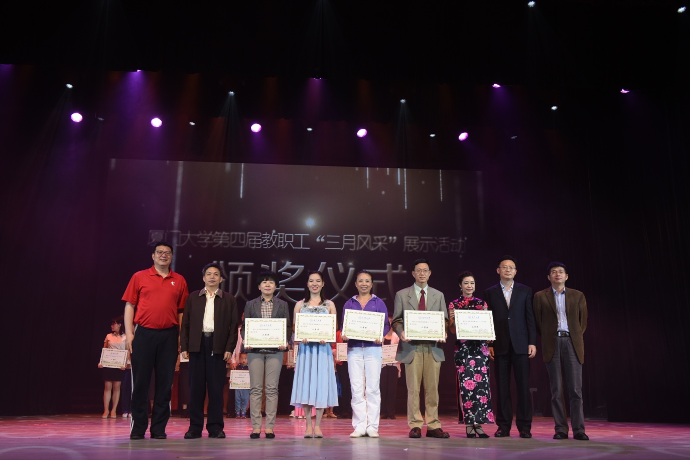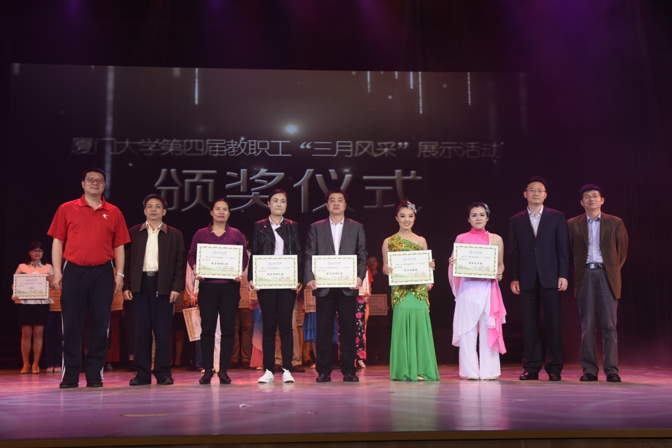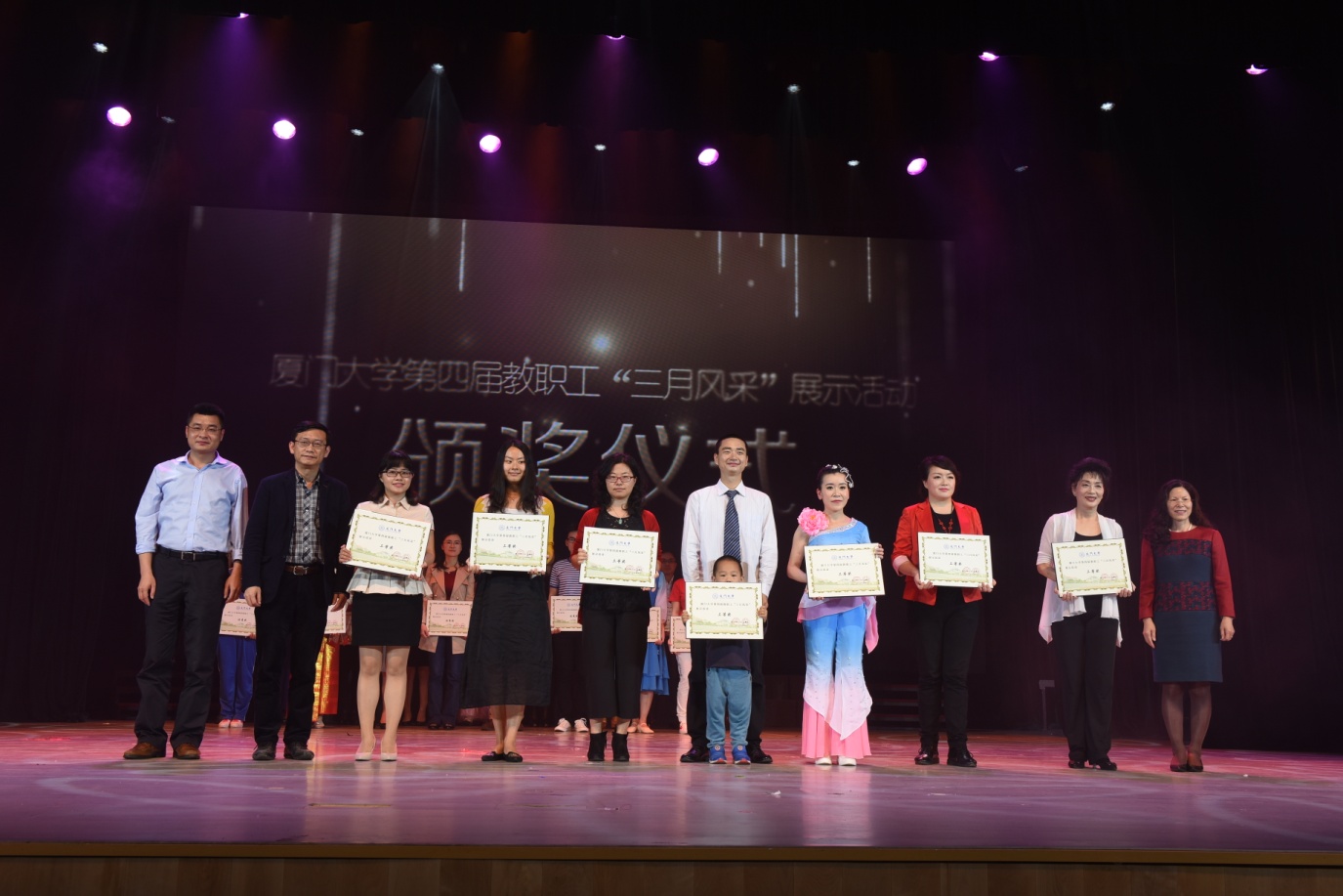 4月16日晚7时,由校工会、校妇委会联合主办的主题为“春暖厦大,巾帼芳华”的厦门大学第四届教职工“三月风采”展示活动决赛在建南大会堂顺利举行。我校党委副书记、纪委书记、校工会主席赖虹凯,党委副书记林东伟,关工委主任陈力文,组织部部长孙理,宣传部部长徐进功,学生处处长夏侯建兵,离退休处处长郑建华,校工会常务副主席宋毅,校妇委会主任蒋月,校团委书记陈怀锋等有关领导和有关单位党委书记、院长、工会主席和妇委会主任,师生代表观看了演出。