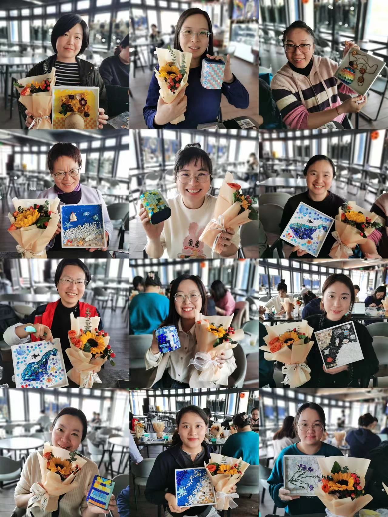 在三八妇女节来临之际,能源学院妇委会组织了“巧手生花,绘出幸福“创意手工DIY活动。在小巨蛋广场巨大的绿茵草坪上,女教工们手捧学院精心准备的手捧花,尽情享受春日午后和暖的阳光。回到室内,来不及仔细听完负责老师对马赛克手工作品制作方法的讲解,大家就踊跃挑选自己喜欢的材料包,兴致勃勃开始用彩色粘胶给作品画初稿,彩石、瓷片、干花、贝壳、帆船,宇航员等各种材质和主题吸引了老师们。经过一个小时的忙碌,一件件精美的作品呈现在大家面前,幸福的笑容也洋溢在每张脸上。