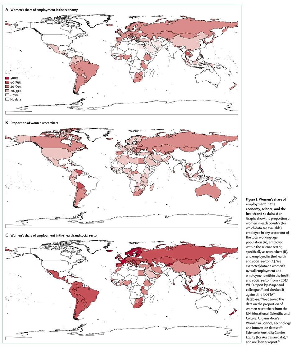 世界上30%的研究人员为女性 ——女性研究人员占比在南亚和西亚约为19%,在东亚和太平洋国家约为23%,在撒哈拉以南非洲约为30%,在北美和西欧国家约为32%,在拉丁美洲约为45%。女性占全球医疗卫生工作从业总人数的75%。但在所有领域中,从事初级和低薪岗位的女性人数比例过高,身居领导职位的女性更是凤毛麟角。