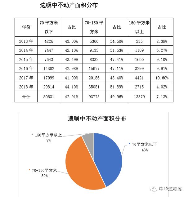 与此同时,老年人住房面积以改善型住房为主。2013年至2018年间,遗嘱中涉及的房产面积集中在70至150平方米,占比49.96%,其次,房产面积在70平方米以下的,占比42.91%;房产面积在150平方米以上的,占比7.13%;数据显示近六成老人住房面积超过70平方米;说明老年人多为改善型住房。