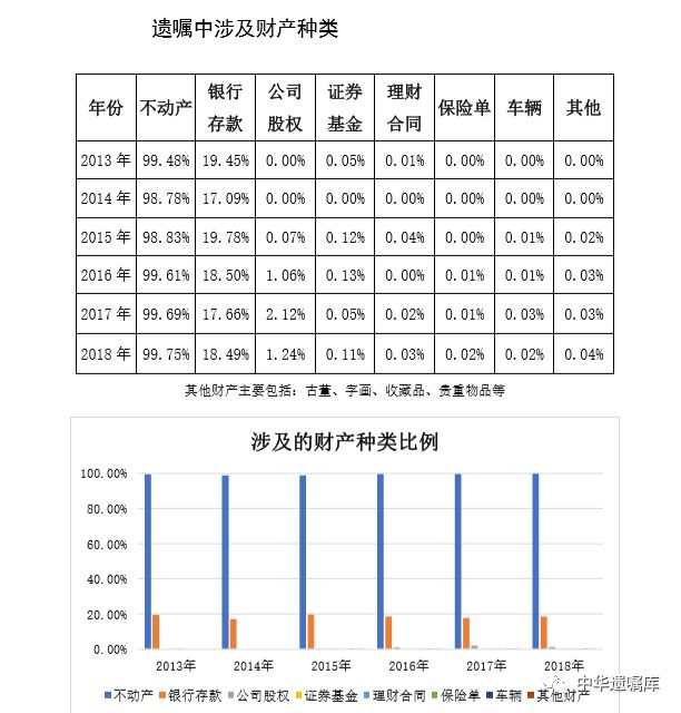 同时,从各地数据分析可以看出,“北上广”由于经济发展迅速,遗嘱中财产种类丰富的特点比较明显。2017年至2018年,中华遗嘱库所登记的北京地区的遗嘱中,处理不动产的比例达分别达到99.72%、99.87%;其次是银行存款。
