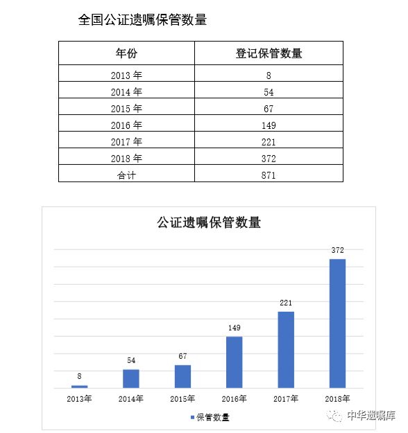 在《2019中华遗嘱库白皮书》中首次披露了公证遗嘱保管在中华遗嘱库的数量。从2013年建立至2018年,每年保管公证遗嘱数量从8份上升到372份,总数达到871份,其中2016年至2018年增长迅速。选择将公证遗嘱存放中华遗嘱库的人中以北京和广东地区居多。