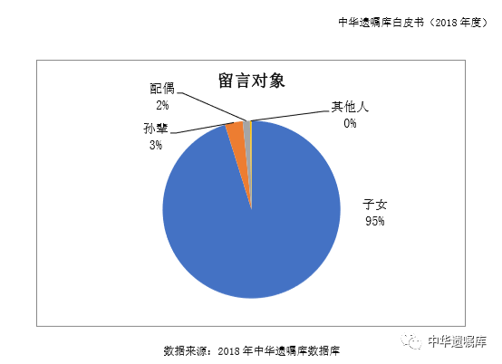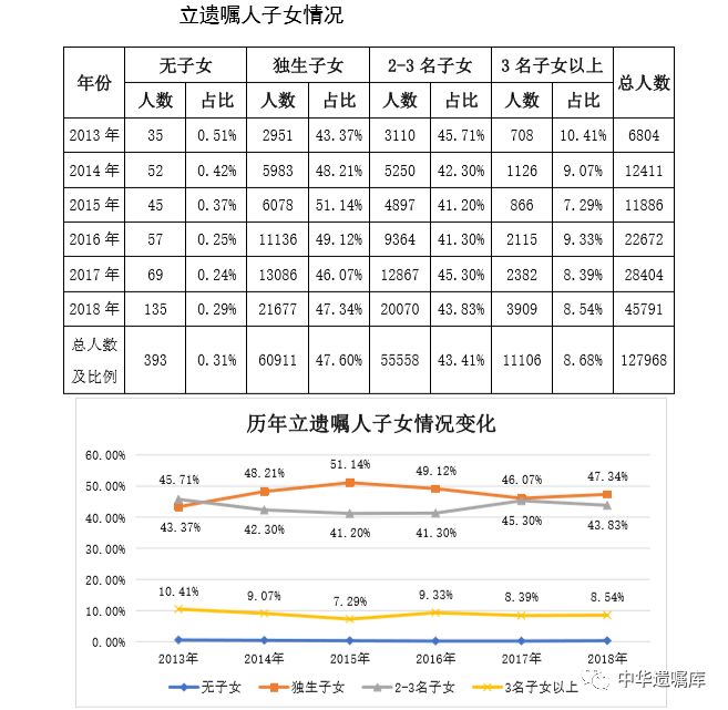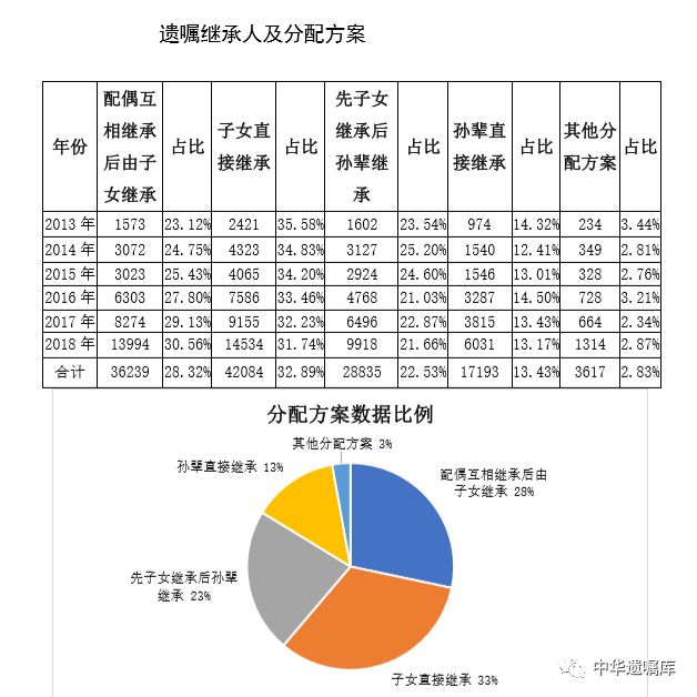 受中国人传统思想影响,立遗嘱人在遗产分配上,子女以及孙子女仍是主要继承人。2013年至2018年间,子女作为继承人的达到55%;但同时,“配偶先继承,子女后继承”的比例逐年在上升。