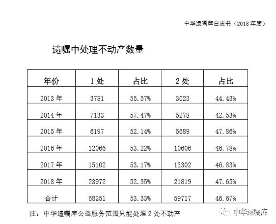 中华遗嘱库启动六年来,中华遗嘱库和全国各地的公益机构合作,已经在北京、天津、广东、江苏、广西、上海、重庆7个地区建立了公益遗嘱登记中心;北京、广东地区已开设第二登记中心;截至2018年底,已为127968名老年人办理了遗嘱。