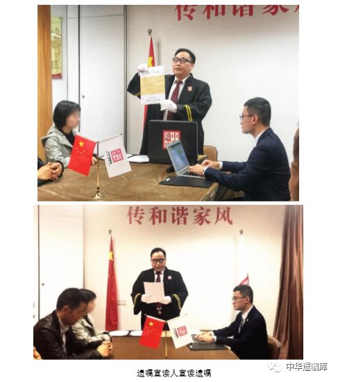 2018年12月,中华遗嘱库首创了“遗嘱宣读仪式”。遗嘱宣读仪式是立遗嘱人生前委托中华遗嘱库在其去世后,由遗嘱宣读人召集亲友宣读遗嘱的一种家庭仪式。主要目的是通过这种仪式更好地传递立遗嘱人的意愿,表达对家人的关爱,促进家庭的凝聚力,延续家风。除此以外,遗嘱宣读仪式也有一种庄严权威的氛围,有助于促成家人之间的和解,更好地保障遗嘱的有效执行。