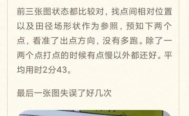 训练结束后,她立刻在手机备忘录做了复盘,记录下了出现问题的原因。经过总结,她认为最主要的失误是点位预知错误,影响了后续打卡的连贯性。所以在后续的训练中,她就有意识地放慢了速度,更慎重地对点位和路线进行规划。