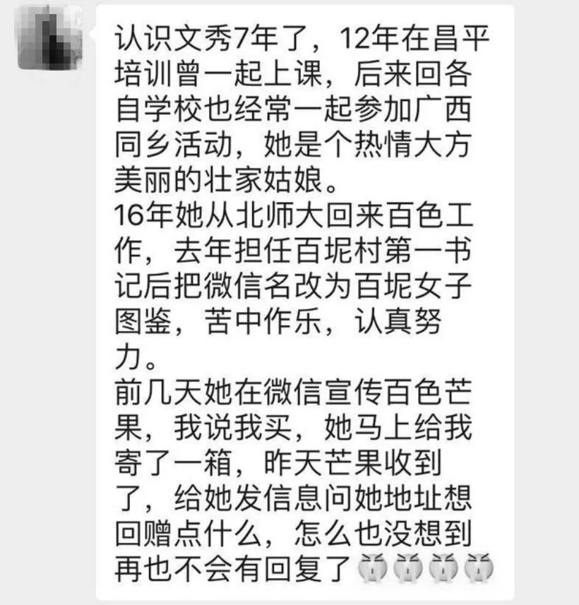 6月16日,黄文秀寄了一箱芒果给在南宁工作的另一名选调生。6月17日,芒果已经收到,但是……“文秀,你寄来的芒果我收到了,可我再也听不到你的声音了!”